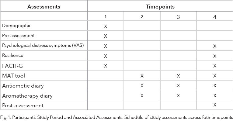 The study team created and provided an Aromatherapy Diary for the participants to record their weekly usage by date and time, as well as an evaluation of the aromatherapy. The evaluation assessed the effects of aromatherapy on CINV by asking the participants, “Did the aromatherapy take away your nausea?” Answers ranged from “it took away my nausea completely” to “it had no effect on my nausea.” If the participants did not get relief from the aromatherapy, the participants had the option to take the prescribed antiemetic.
