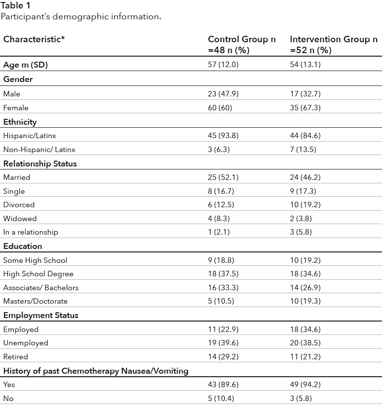 Demographic and sample characteristics (pre-assessment demographic checklist) The study included a total of 100 participants randomly assigned to either the control group (48%) or the intervention group (52%). More than 52% of participants in the control group and 67% in the intervention group were female. A majority of participants in both groups identified as Hispanic/Latino(a) and were either married or in a relationship and were unemployed or retired (see Table 1 for additional demographic information).