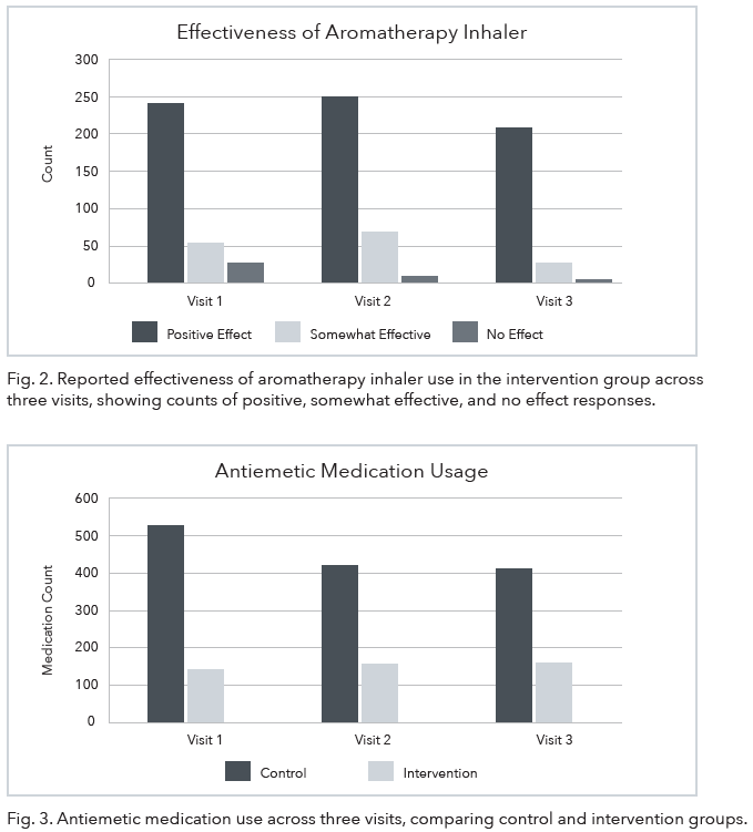 The findings from this randomized clinical trial highlight the potential benefits of 9 aromatherapy inhalation as a complementary therapy for managing CINV. Based on this study’s results, the use of the aromatherapy inhaler had positive effects on participants. The intervention group used antiemetic medication at a much lower rate, had an increase in resilience, a decrease in anxiety, and a greater sense of wellbeing. These findings suggest that there may be clinically meaningful differences for patients undergoing chemotherapy that experience CINV.