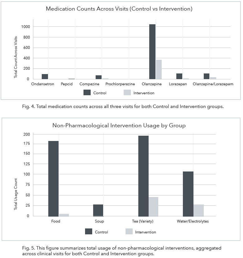 Descriptive statistics (frequency counts) were used to examine the use of antiemetic medication for the intervention and control groups across multiple visits. Frequency counts were also used to analyze the type of antiemetic medication reported by condition as well as common non-pharmacological interventions used by condition across multiple visits. To assess severity of acute and delayed chemotherapy-induced nausea, median ratings from the MAT were aggregated across all timepoints and compared by condition. To assess severity of acute and delayed chemotherapy-induced vomiting, the proportion of participants who reported vomiting on the MAT was averaged across study timepoints and compared by condition.