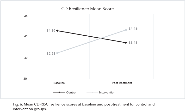 The change from baseline to post-treatment on the CD-RISC was not statistically significant, F (1, 16) = 0.00, p = .986. Moreover, this change did not differ by condition, F (1, 16) = 1.12, p = .307. Examination of individual CD-RISC subscales for the control group did not reveal any significant differences on Flexibility (p = .476), Self-Efficacy (p = .585), Emotion Regulation (p = .808), Optimism (p = .183), and Cognitive Focus (p = .789). For the intervention group, significant changes were observed in Flexibility (p = .036), but not on Self-Efficacy (p = .430), Emotion Regulation (p = .169), Optimism (p = .934), and Cognitive Focus (p = .448). An interesting finding is that CD resilience mean score from baseline to post-intervention increased in the intervention group as compared to a decrease in the control group (see Fig. 6).
