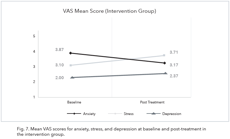 In the control group, there was no significant change as a result of the intervention on anxiety (p = .723), stress (p = .587), or depression (p = .786). Similarly, no significant differences were found among the intervention group on anxiety (p = .798), stress (p = .400), or depression (p = .180). Of note, the intervention group VAS mean score showed a decrease in anxiety (3.87–3.17) from baseline to post-intervention (see Fig. 7).