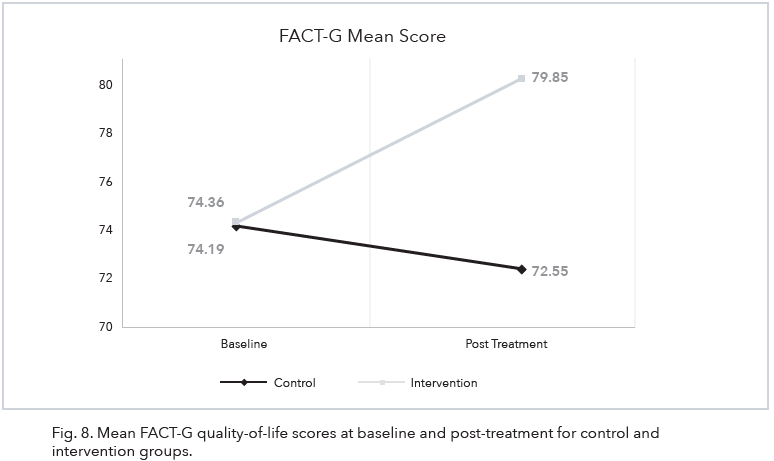 The change from baseline to post-treatment on the FACT-G total score was not statistically significant, F (1, 16) = 0.23, p = .636. Moreover, this change did not differ by condition, F (1, 16) = 0.02, p = .885. Examination of individual FACT-G subscales for the control group found a significant change in Emotional Wellbeing (p = .031) but not Physical Wellbeing (p = .265), Social Wellbeing (p = .415), or Functional Wellbeing (p = .364). For the intervention group, no significant changes were observed on Physical Wellbeing (p = .942), Social Wellbeing (p = .314), Emotional Wellbeing (p = .145), or Functional Wellbeing (p = .661). However, the FACT-G mean score from baseline to post-intervention increased in